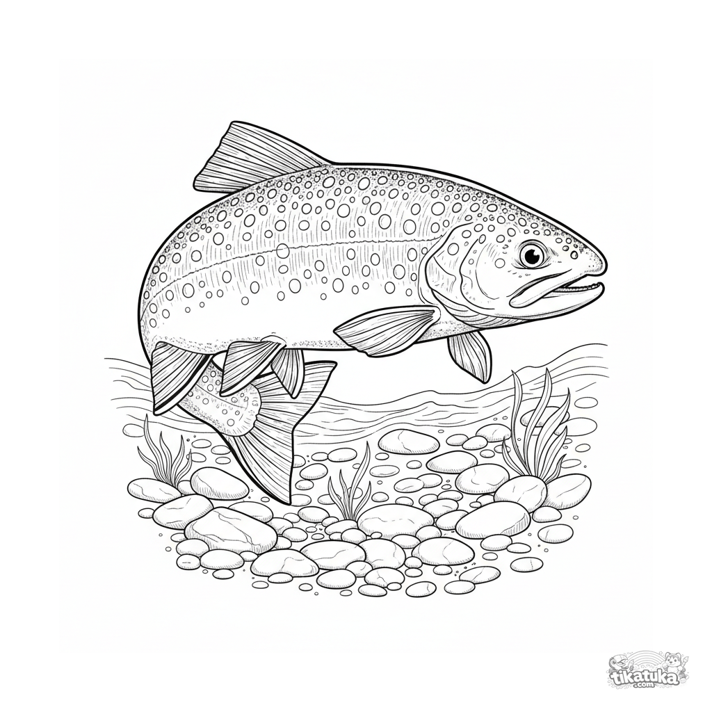 Página para colorir detalhada para crianças mais velhas de 10 a 12 anos: uma truta-marisca nada rio acima em um riacho rochoso claro. Padrões intrincados.