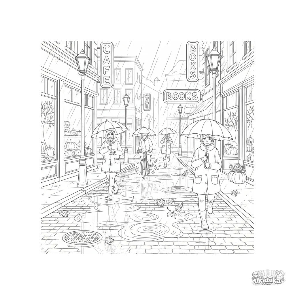 Página para colorir complexa para crianças maiores de 10-12 anos: uma cena detalhada de uma rua da cidade em uma noite chuvosa de outono com reflexos em poças, pessoas sob guarda-chuvas e vitrines.