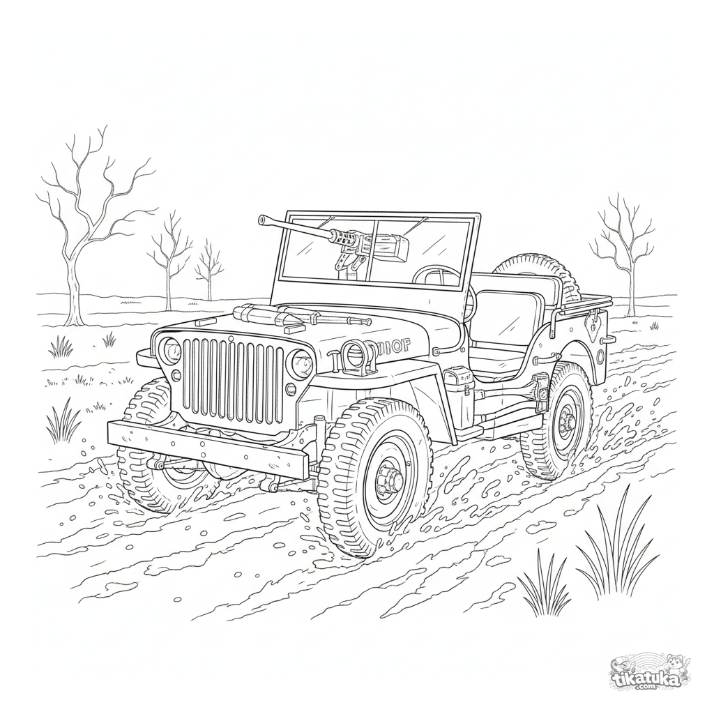 Página para colorir difícil para meninos 7-12 anos: um jeep militar da Segunda Guerra dirigindo por um campo lamacento. Estilo realista.