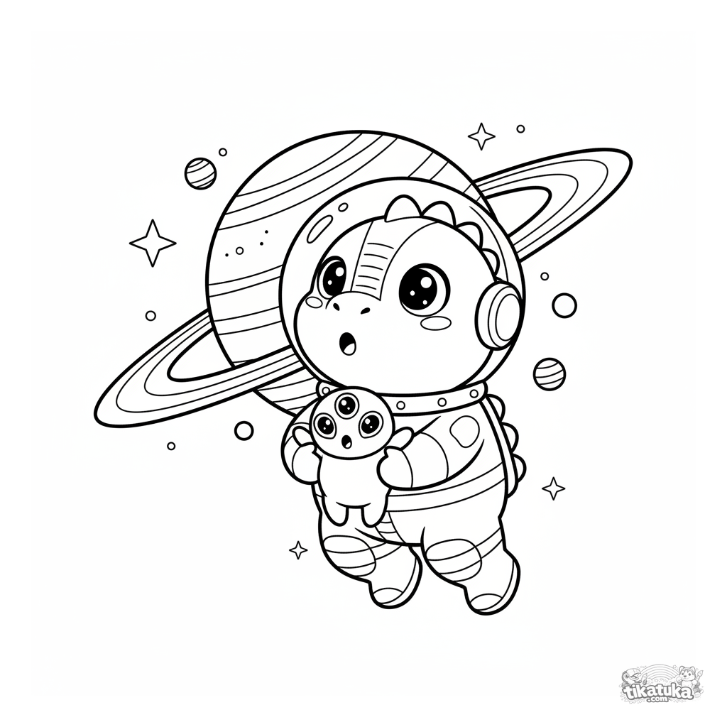 Página para colorir para crianças 4-6: o herói dino explorador em traje espacial flutua perto de um planeta anelado, segurando um alienígena amigável de três olhos.