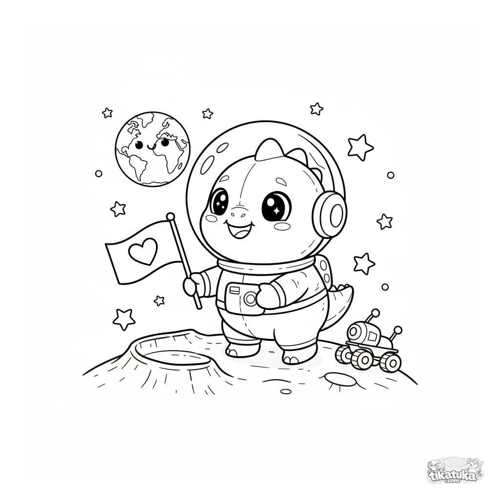 Página para colorir de um dino explorador astronauta plantando uma bandeira em uma cratera lunar. Para crianças de 4 a 6 anos.