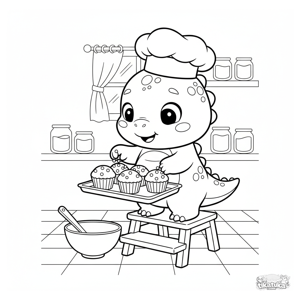 Página para colorir para crianças de 4-6 anos: fofo dino explorador com chapéu de chef fazendo cupcakes em uma cozinha aconchegante. Desenho em preto e branco para colorir.