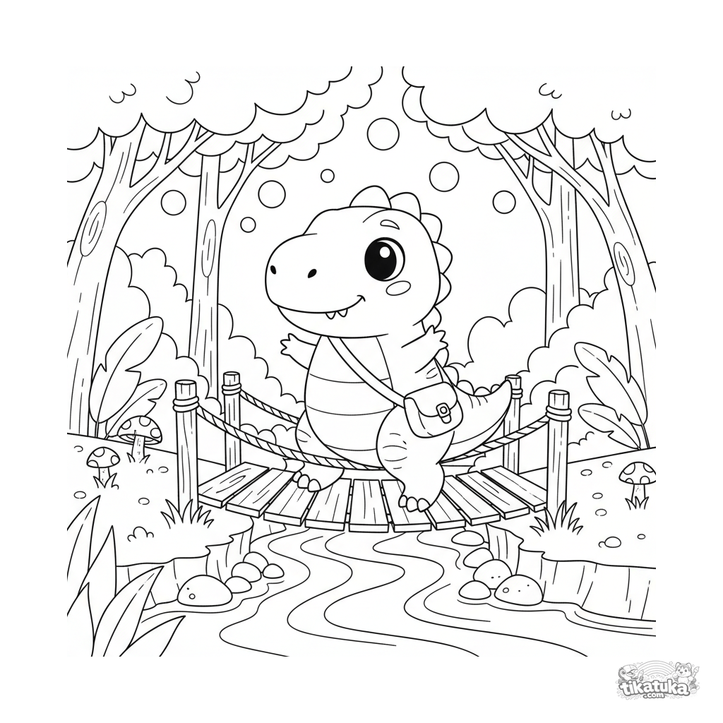 Página para colorir de um fofo dino explorador atravessando com cuidado uma ponte de corda na floresta. Para crianças de 4 a 6 anos.