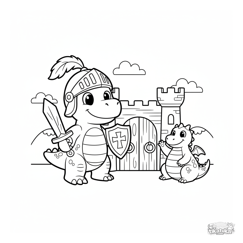 Página para colorir de um dino explorador cavaleiro corajosamente em pé diante de um castelo e um dragão amigável. Para crianças de 4 a 6 anos.