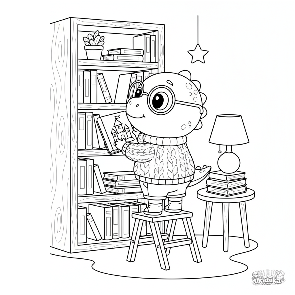 Página para colorir para crianças 5-9: o herói dino explorador usa óculos e trabalha como bibliotecário, organizando livros cuidadosamente em uma biblioteca aconchegante.