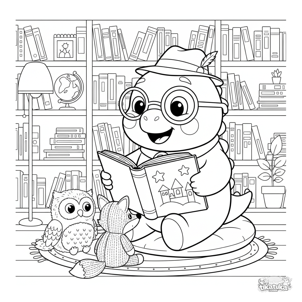 Página para colorir para crianças 4-6: o herói dino explorador com óculos senta-se em uma almofada em um cantinho aconchegante da biblioteca, lendo um livro para amigos de pelúcia.