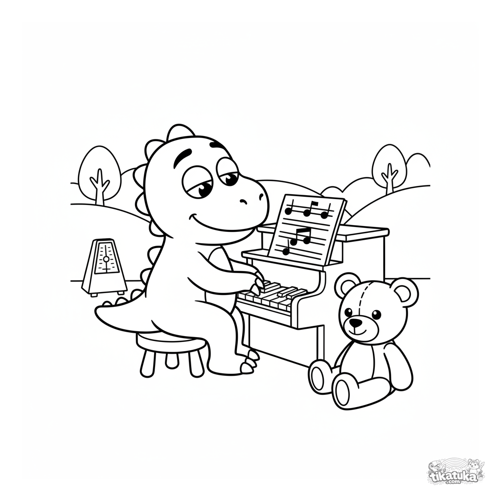 Página para colorir para crianças 4-8: o herói dino explorador aprende a tocar um piano de brinquedo, olhando cuidadosamente para uma partitura com notas simples.