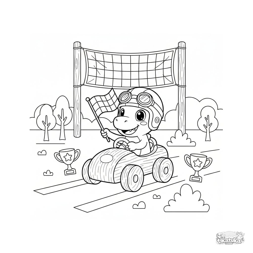 Página para colorir de um dino explorador piloto de corrida celebrando a vitória em um carro de brinquedo. Para meninos de 4 a 6 anos.