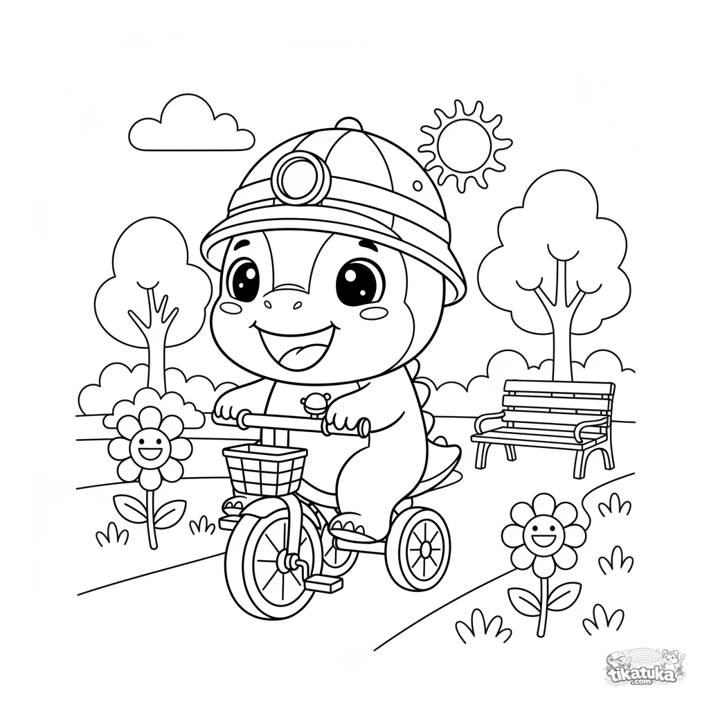Página para colorir para crianças de 4-6 anos: dino explorador com capacete andando alegremente de triciclo vermelho por uma trilha no parque. Desenho em preto e branco para colorir.