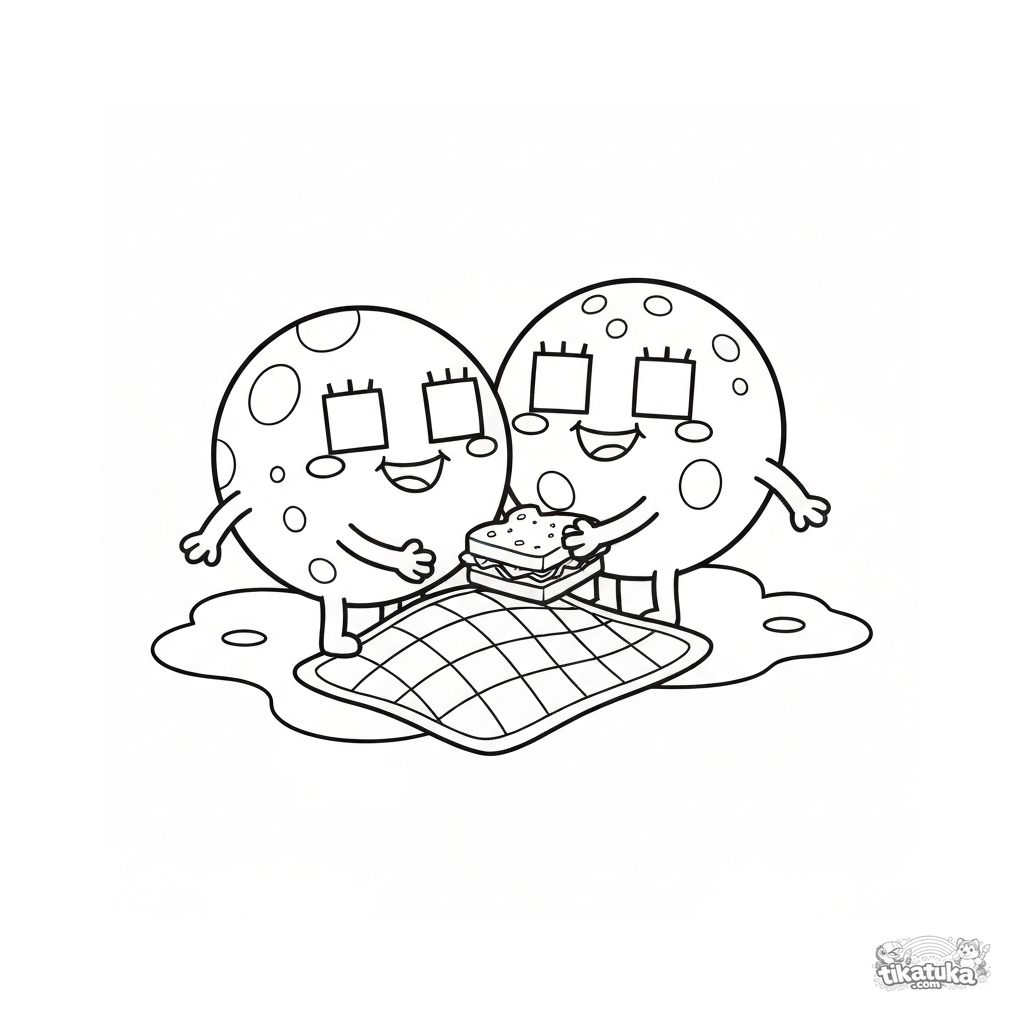 Página para colorir para crianças. Dois micróbios redondos fofos fazendo piquenique com manta xadrez e sanduíche. Estilo cartoon. Download grátis.