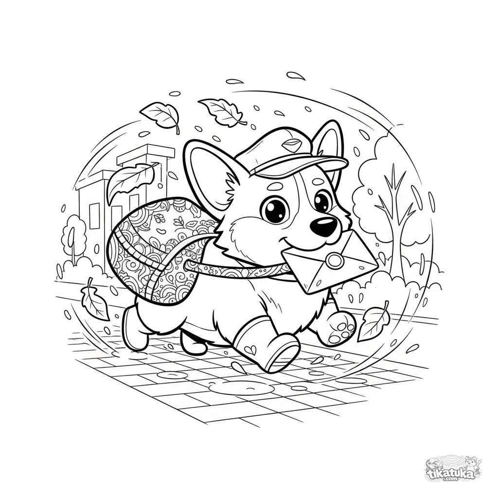 Página para colorir para crianças mais velhas de 10-12 anos: um corgi carteiro determinado com botas e boné se apressa para entregar uma carta em uma tempestade de outono. Cena dinâmica com alto detalhe.