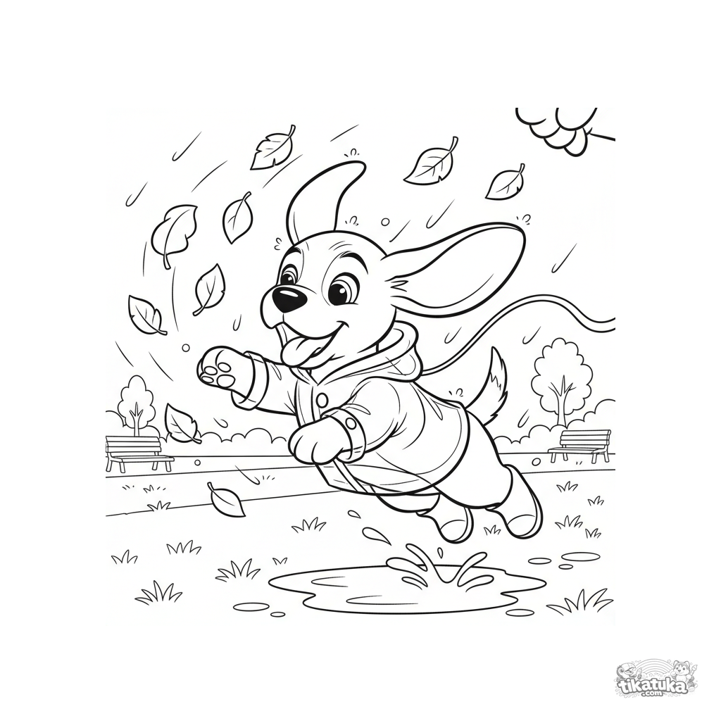 Página para colorir para crianças 7-9: um cachorro brincalhão de capacho e botas salta atrás de folhas caindo num parque outonal com chuva.