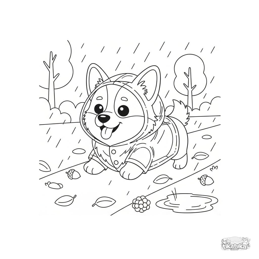Página para colorir para crianças de 4-6 anos: um corgi fofo com capa de chuva passeia em um parque de outono. Detalhe moderado, formas claras.