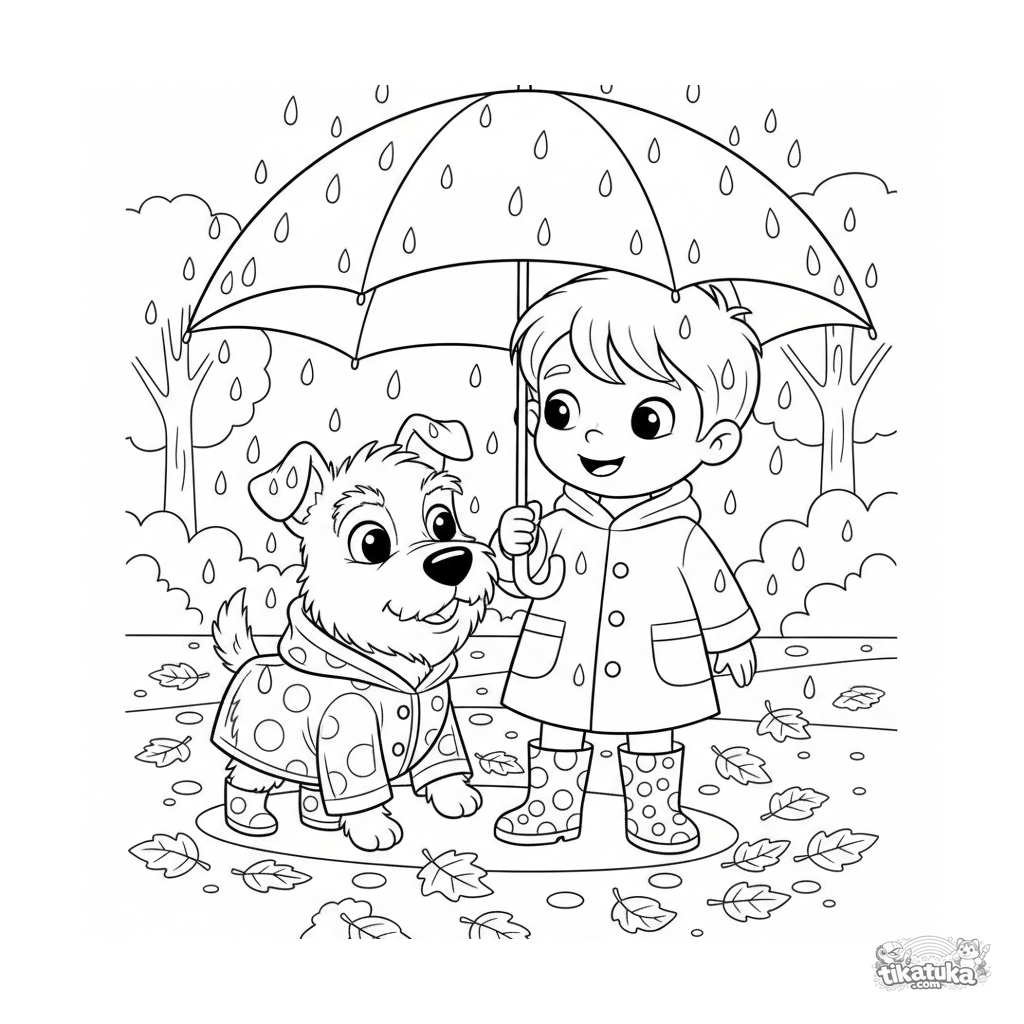Página para colorir detalhada para crianças mais velhas de 10-12 anos: um terrier fofo com capa de chuva transparente e botas passeia com uma criança sob um guarda-chuva em um parque de outono. Cena comovente de amizade e clima de outono.