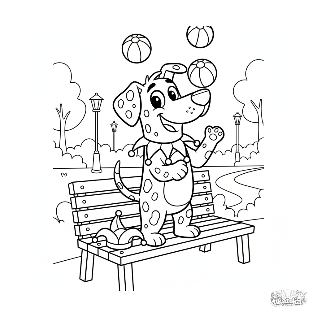 Página para colorir para crianças 4-6: um cão manchado brincalhão faz malabarismo com bolas em pé no banco do parque. Cena dinâmica e engraçada.