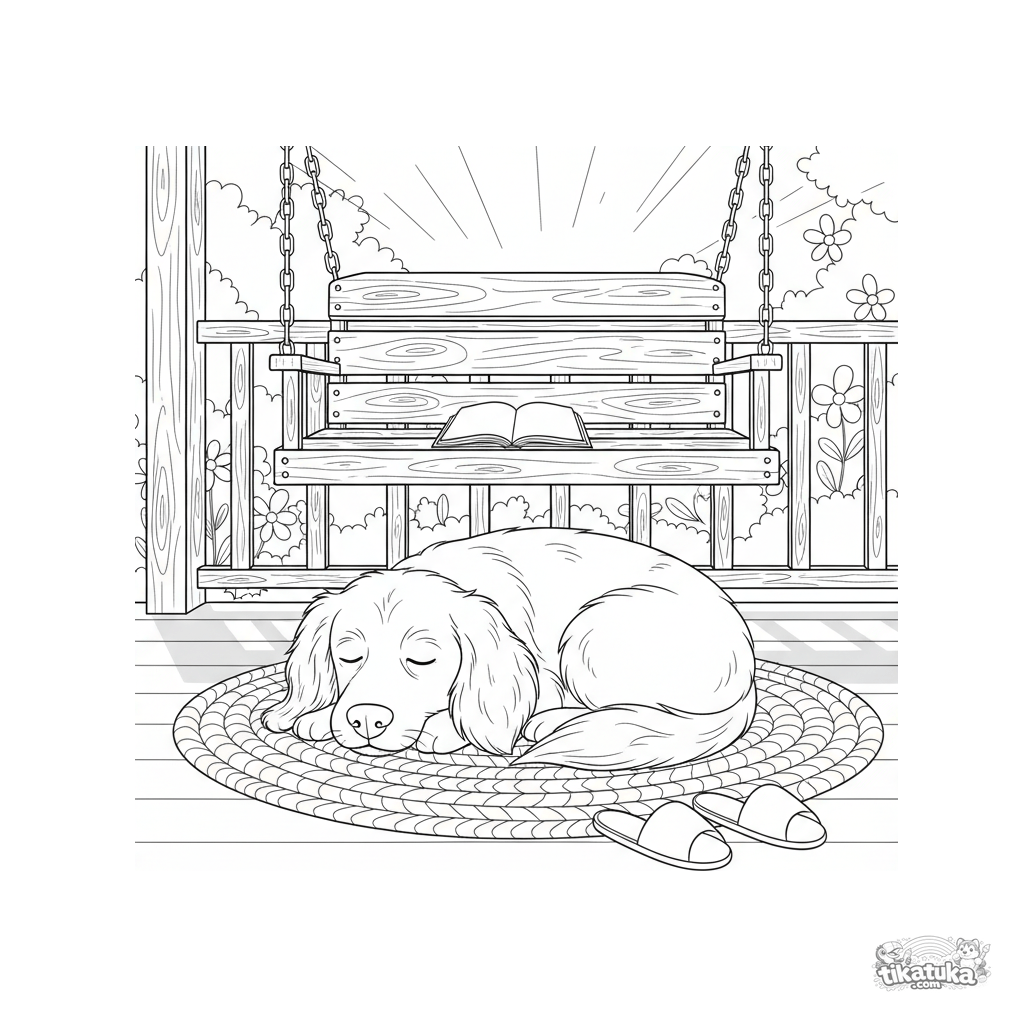 Página para colorir para crianças de 7-9 anos: um cachorro fofo dormindo profundamente sob um balanço na varanda de uma casa de campo. Cena aconchegante com livro e chinelos.