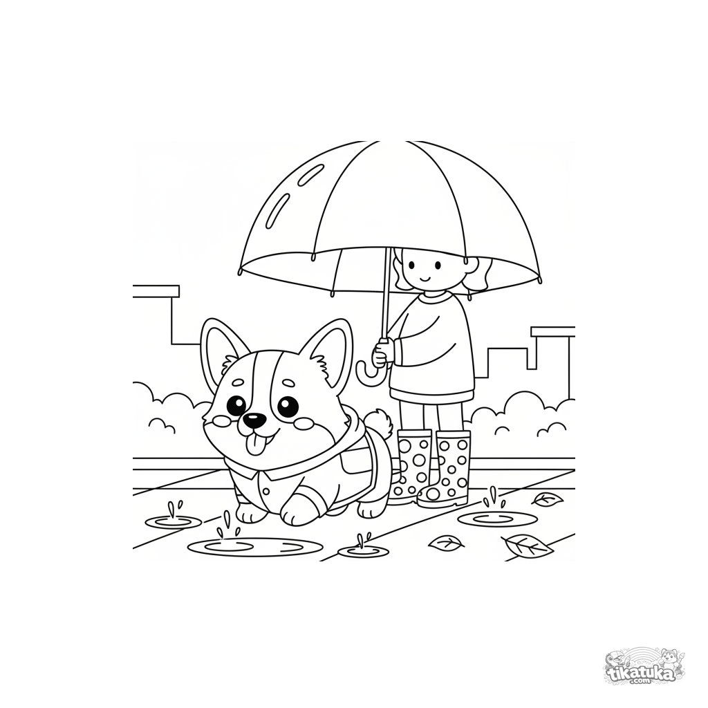 Página para colorir para crianças de 4-6 anos: um corgi fofo com capa de chuva passeia com seu dono sob um grande guarda-chuva em um dia chuvoso de outono.