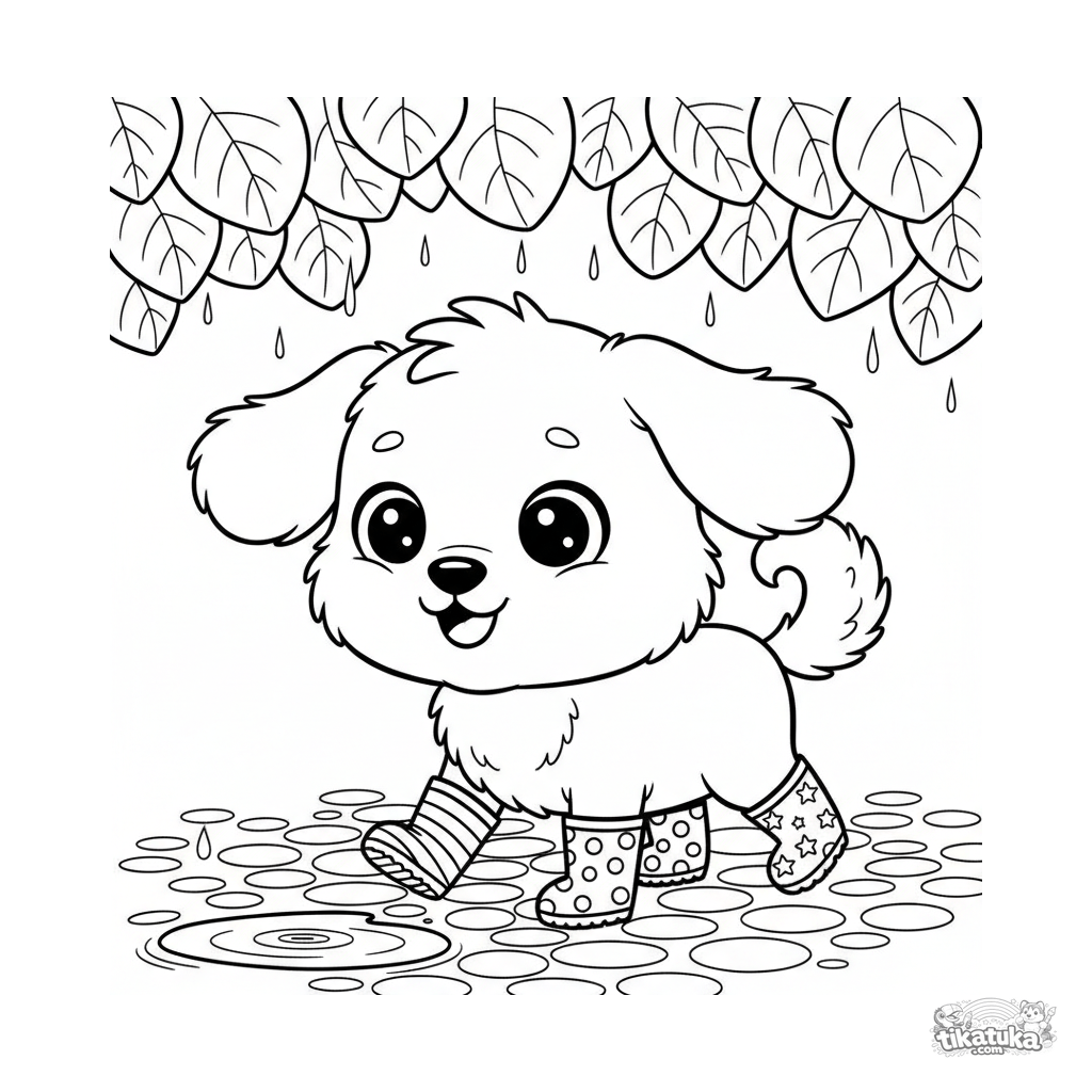 Página para colorir para crianças de 4-6 anos: um cachorro alegre e fofo usando quatro botas de chuva passeia em uma trilha molhada sob a chuva outonal. Cena fofa.