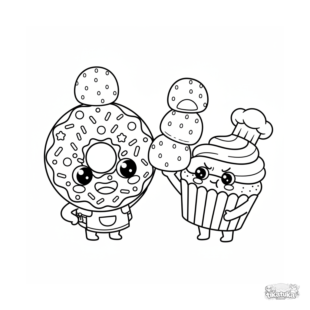 Página para colorir detalhada para crianças mais velhas 10-12: um donut e um cupcake constroem uma torre de mochi de morango em um piquenique. Muitos detalhes e interações.