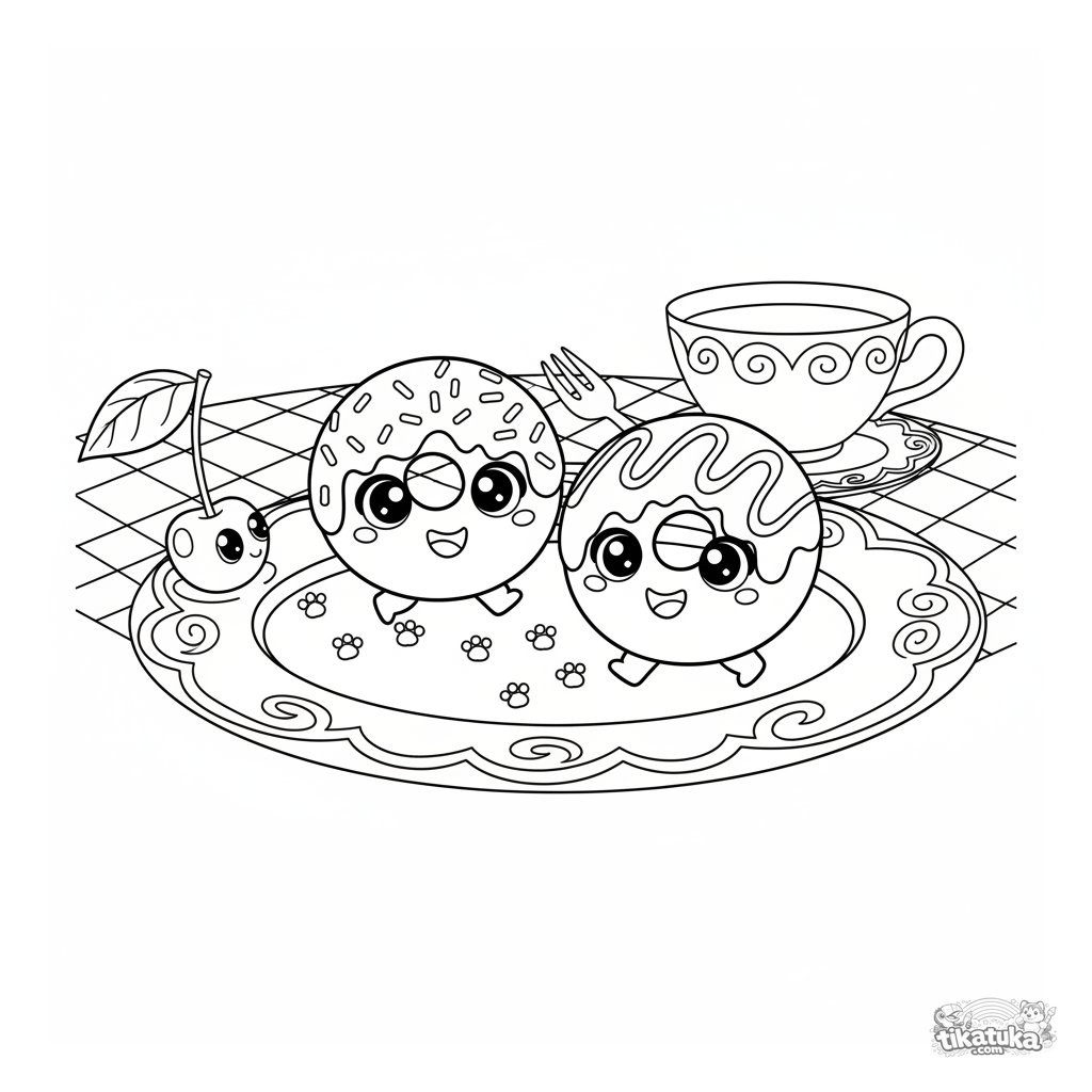 Página para colorir para crianças: dois donuts felizes marcham por um prato de sobremesa. Cena com confeitos e cobertura de chocolate para diversão criativa de crianças de 4 a 6 anos.