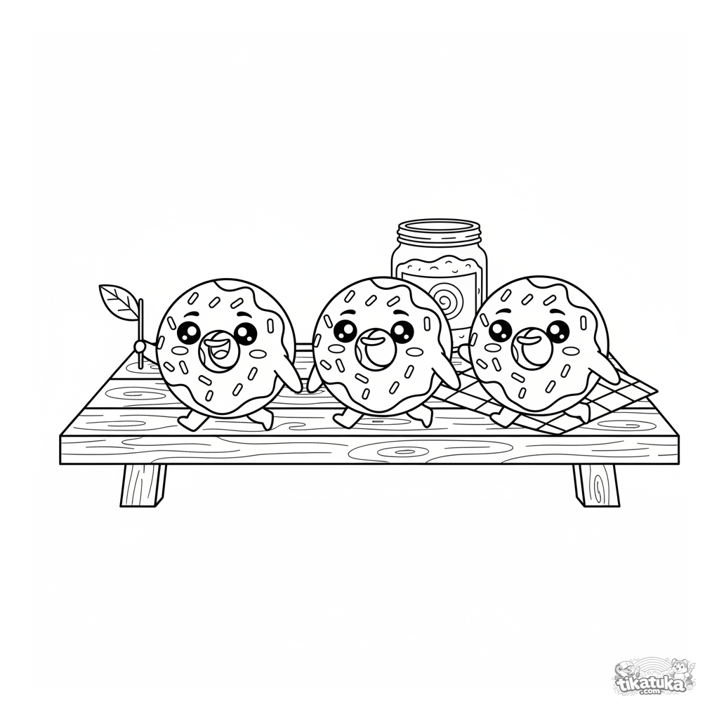 Página para colorir de amigos donuts marchando em uma mesa de piquenique. Para crianças de 4 a 6 anos. Apresenta três donuts com confeitos caminhando em passo na mesa de madeira.