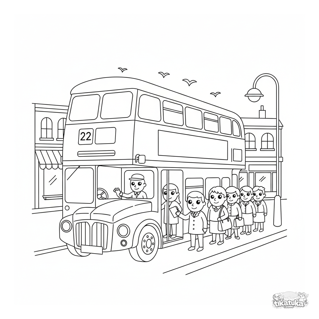 Página para colorir: um famoso ônibus de dois andares no ponto, passageiros embarcando. Detalhes: topo aberto, número da linha, cobrador.