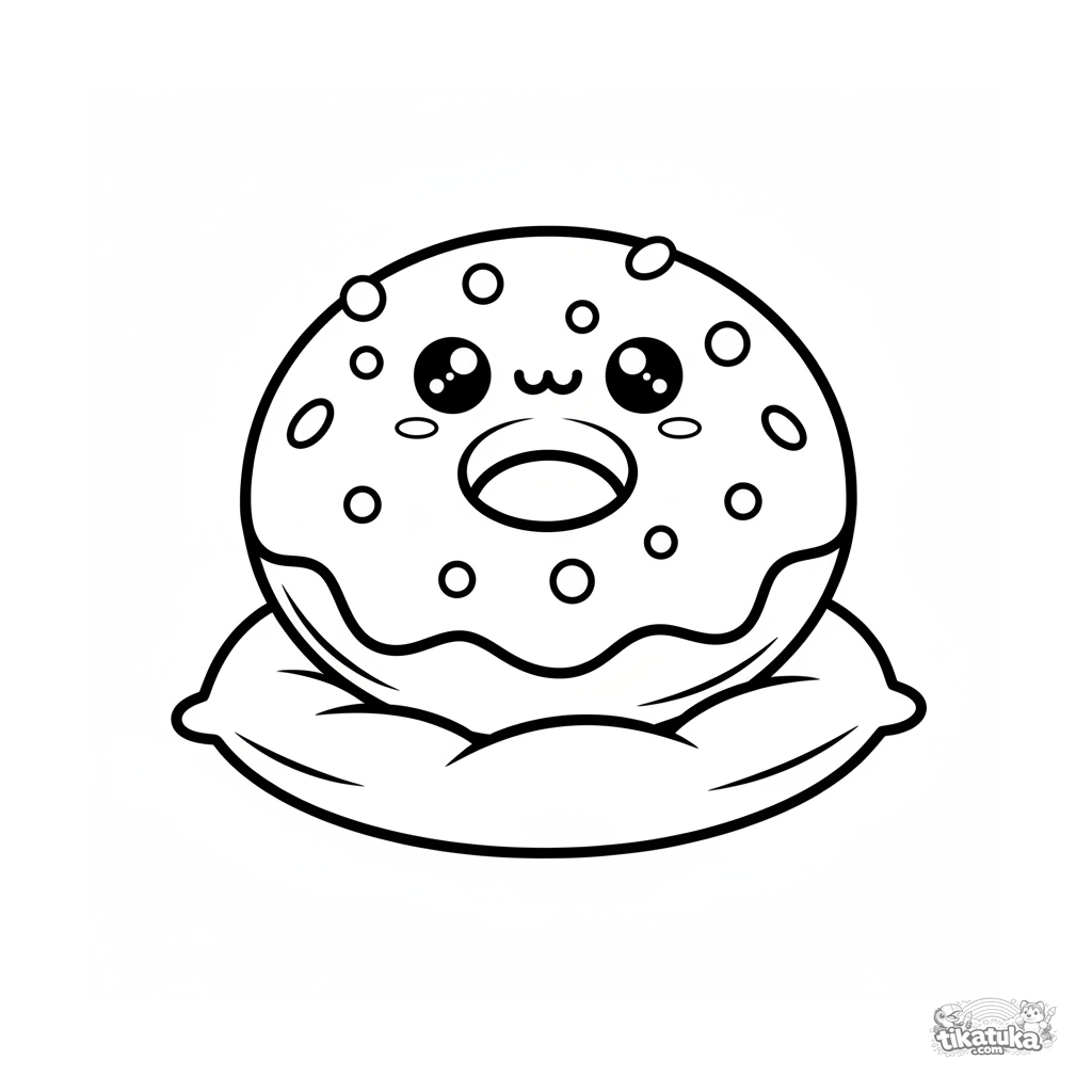 Página divertida para colorir para 2-3 anos: uma rosquinha sorridente com granulados em um travesseiro. Contorno simples, forma grande, ajuda a aprender formas.