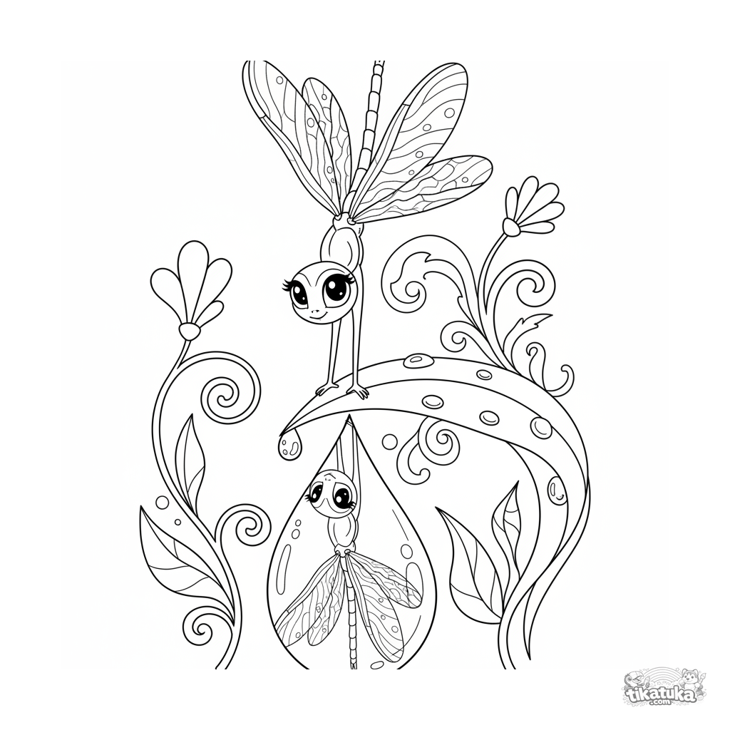 Página para colorir para 7-9 anos: uma libélula graciosa faz uma bananeira na ponta de uma folha. Cena com reflexo e linhas decorativas.
