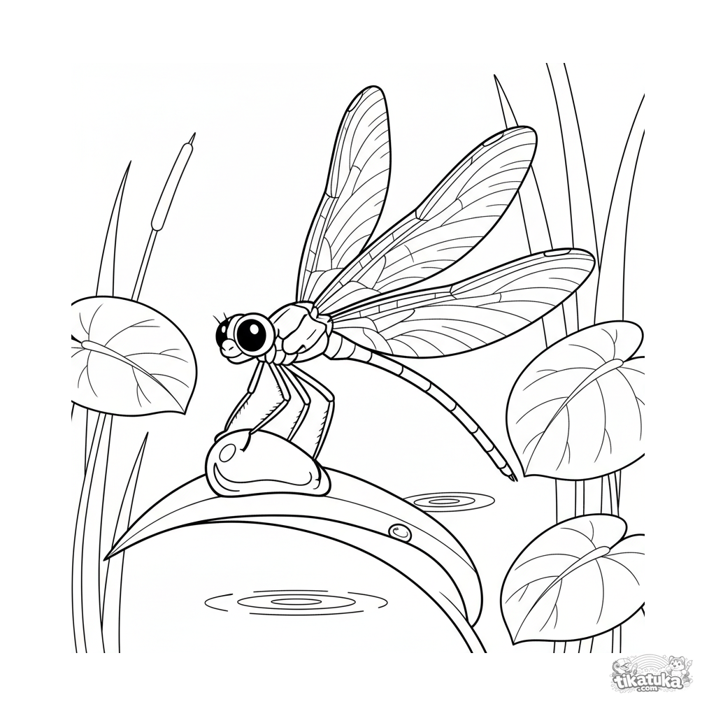 Página para colorir para crianças 4-6: uma libélula graciosa se equilibra numa gota de orvalho numa folha grande. Contornos claros.