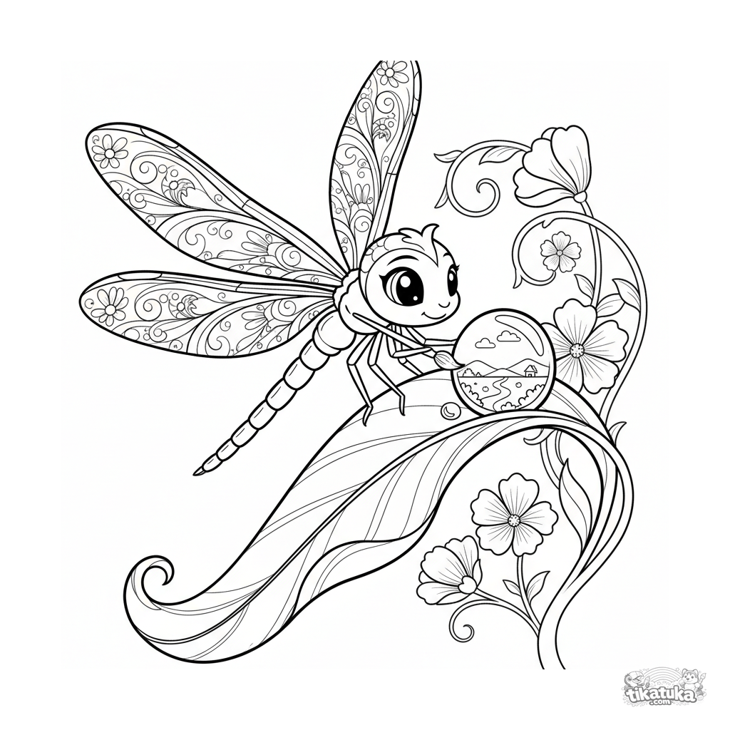 Página para colorir para 7-9 anos: uma libélula graciosa pinta uma paisagem em uma tela de orvalho em uma folha grande.