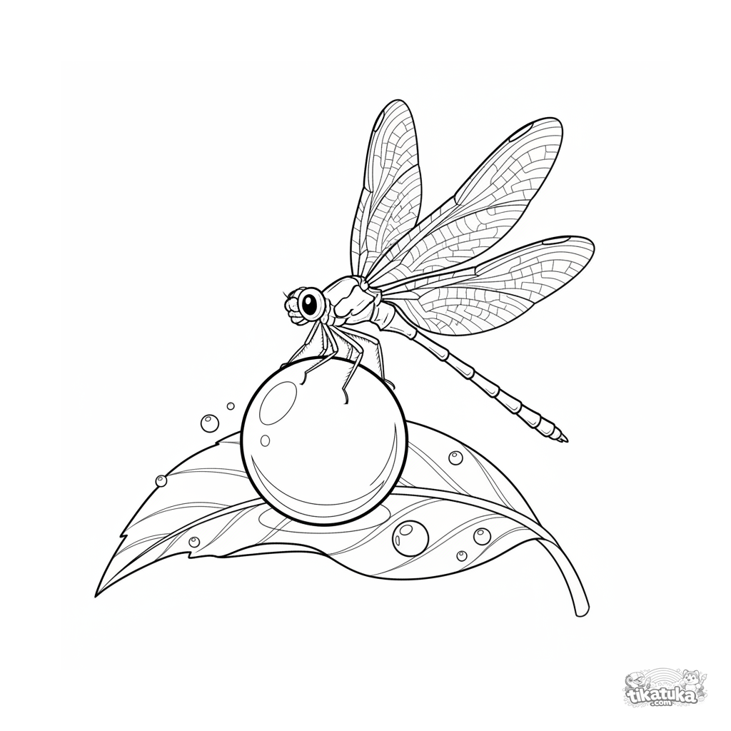 Página para colorir detalhada para crianças 10-12: uma libélula com asas padronizadas pousa em uma gota de orvalho perfeita. Linhas realistas, muitos detalhes.