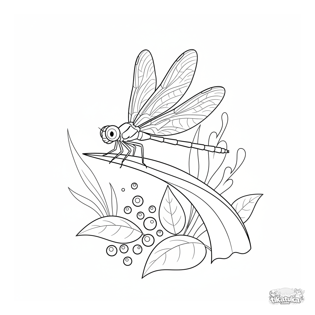 Página para colorir para pré-adolescentes 7-9: uma libélula em estilo realista de guia de campo pousada na ponta da folha observando gotas de orvalho. Detalhe moderado.