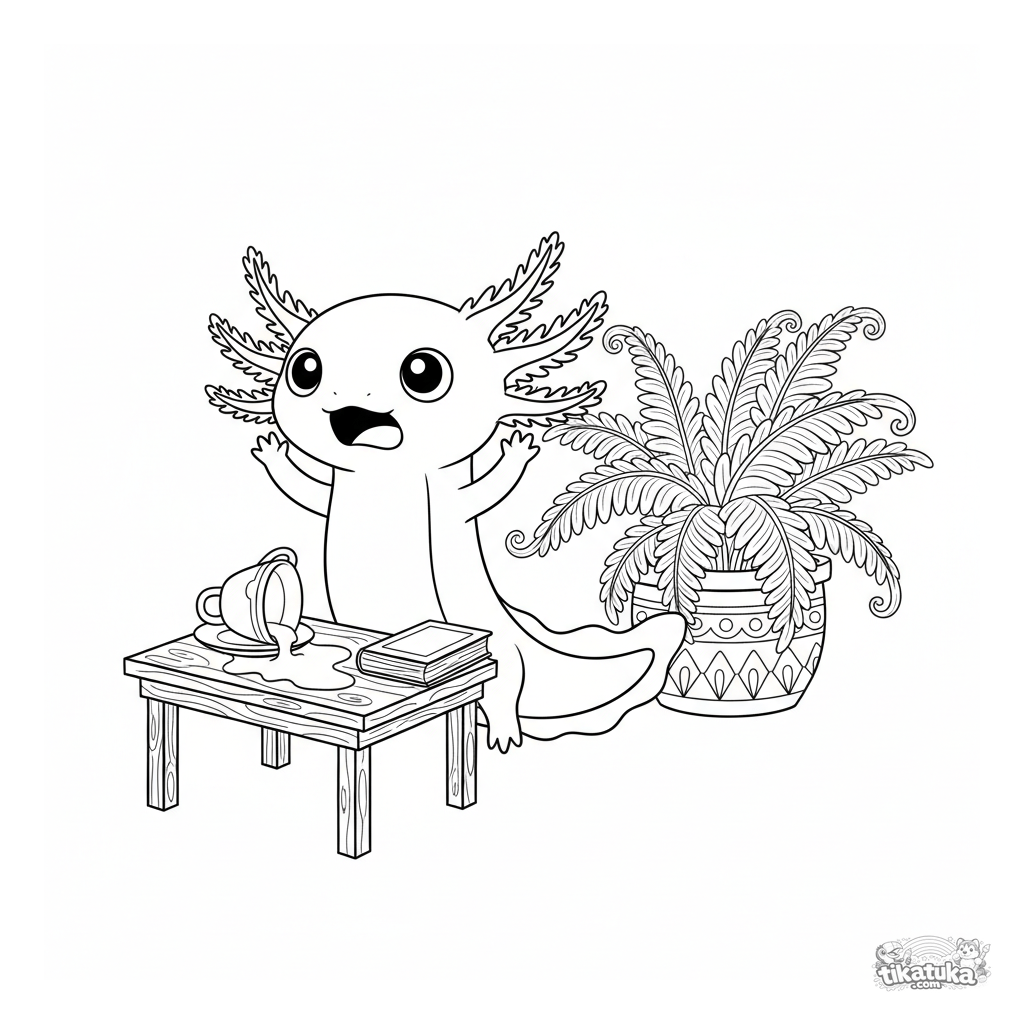 Página para colorir para crianças 7-12: um axolote dramático com brânquias fofas exagera na reação a uma xícara de chá derramada em uma mesinha. Cena de reação engraçada e exagerada.