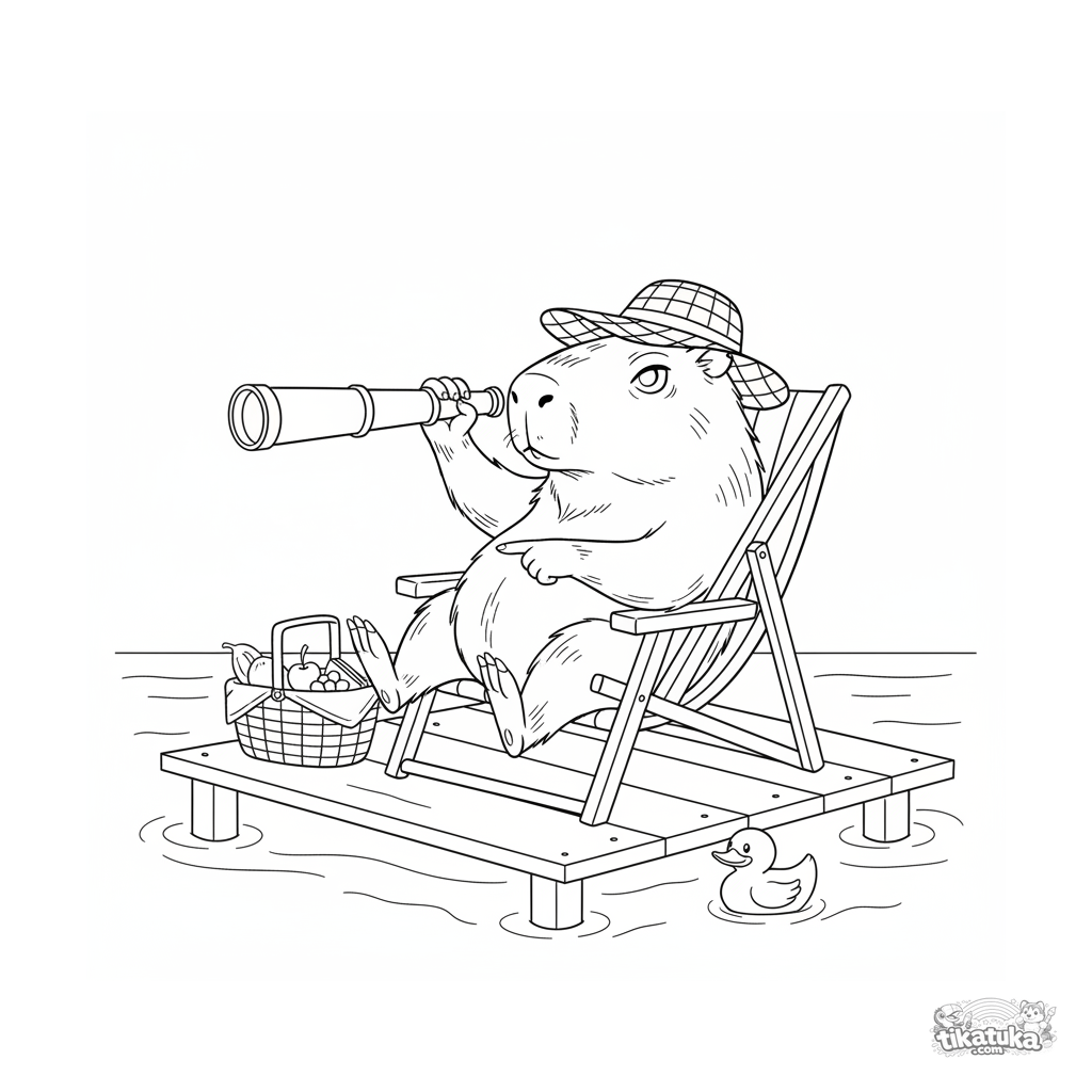 Página para colorir para crianças 10-12: uma capivara dramática em uma cadeira de praia no píer, espiando através de uma luneta. Cena engraçada e detalhada em estilo realista.