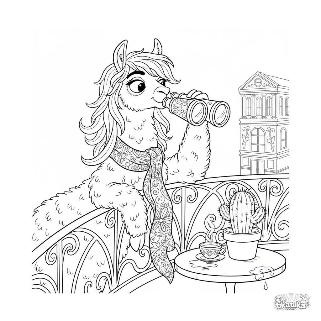 Página para colorir para crianças 10-12: uma lhama dramática de lenço na varanda, olhando a cidade com binóculos. Cena de meme engraçada, estilizada e detalhada.