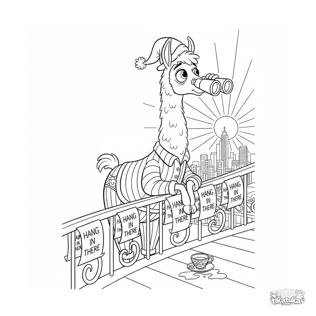 Página para colorir para crianças 10-12: uma lhama cansada e dramática de pijama na varanda com binóculos, observando o nascer do sol.