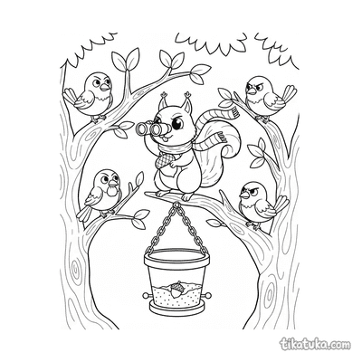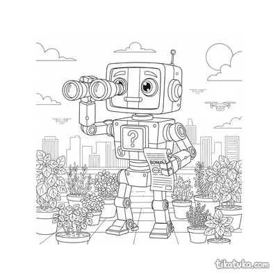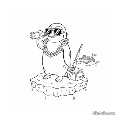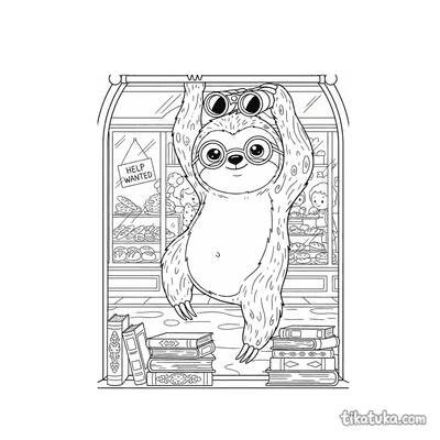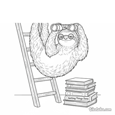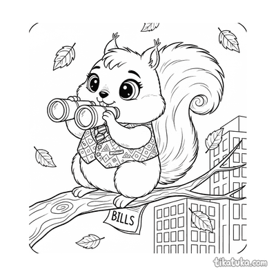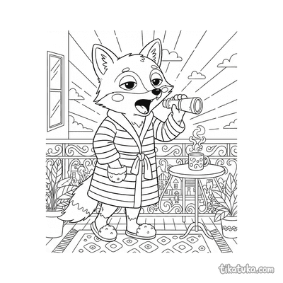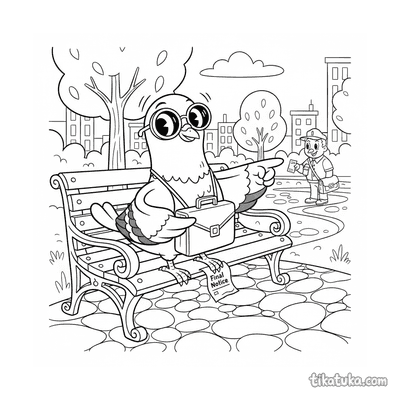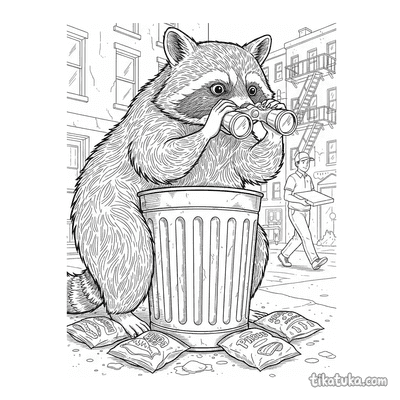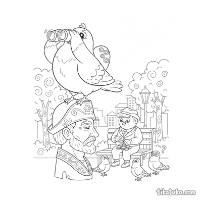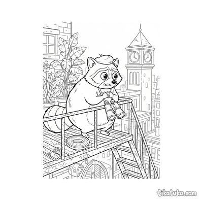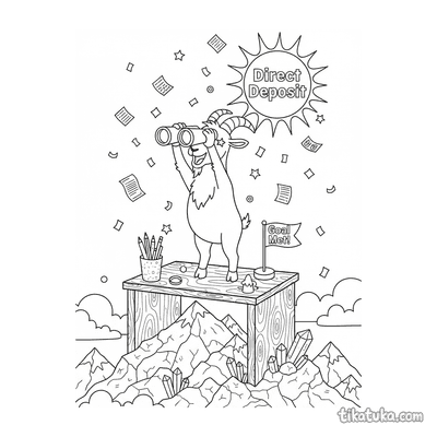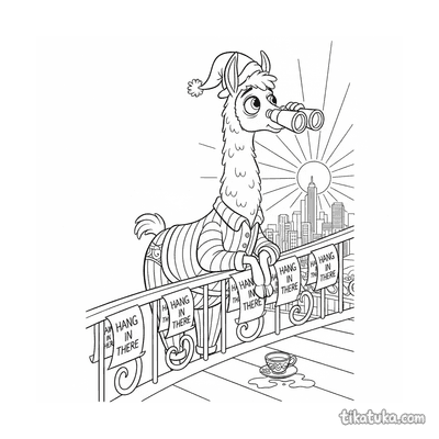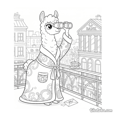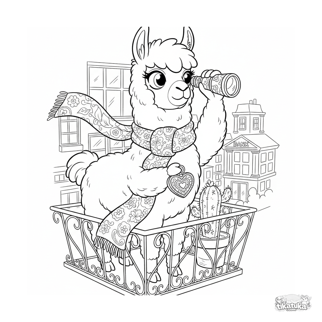 Página para colorir para crianças 10-12: uma lhama dramática e fofa com cachecol usa binóculos para olhar com saudade de uma varanda para um banco distante.