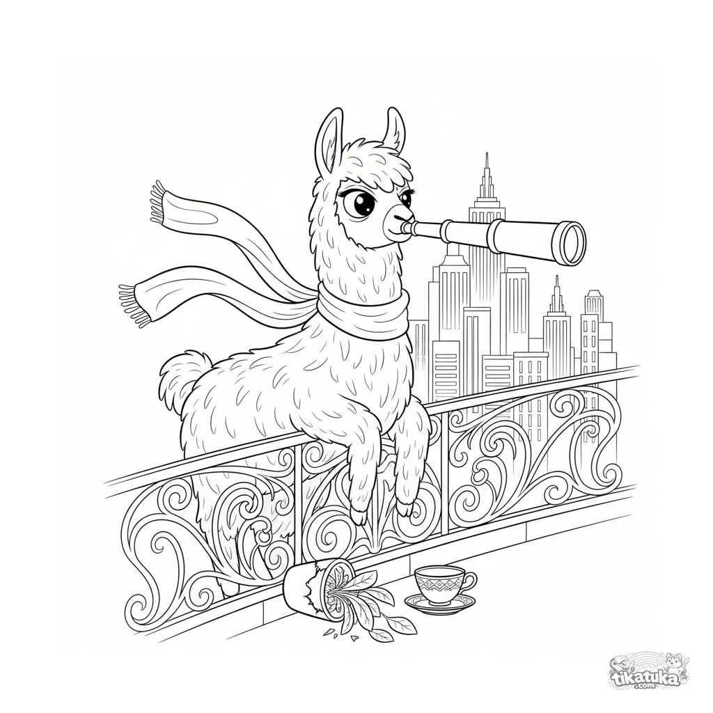 Página para colorir detalhada em estilo Art Nouveau: uma lhama dramática de lenço procura seu salário com uma luneta na varanda. Meme complexo com paisagem urbana para crianças 10-12.