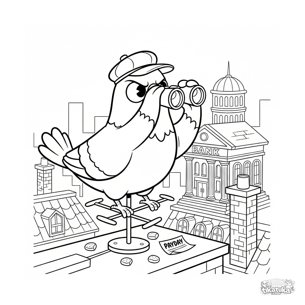 Página para colorir para crianças 10-12: um pombo dramático no telhado usa binóculos para procurar o pagamento. Cena detalhada e engraçada em estilo retrô.