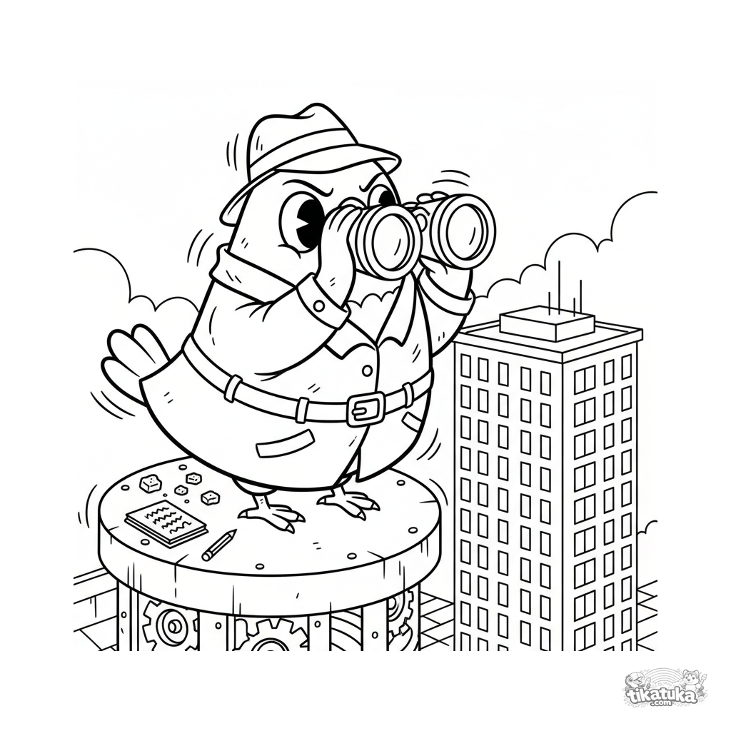 Página para colorir para crianças 10-12: um pombo detetive dramático no telhado de um escritório, espiando com binóculos. Cena de meme engraçada com detalhes.