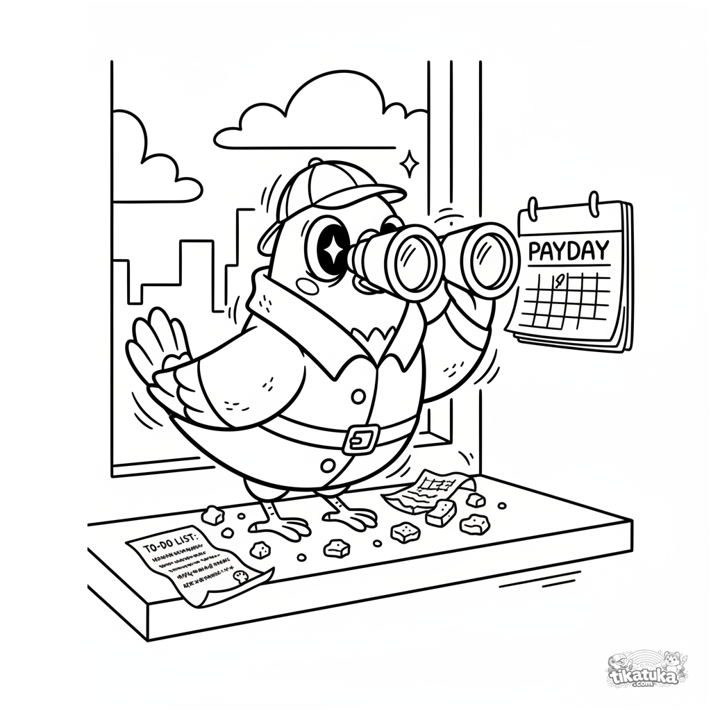 Página para colorir para crianças 10-12: um pombo detetive dramático com binóculos esperando ansiosamente o dia do pagamento no parapeito de um escritório.