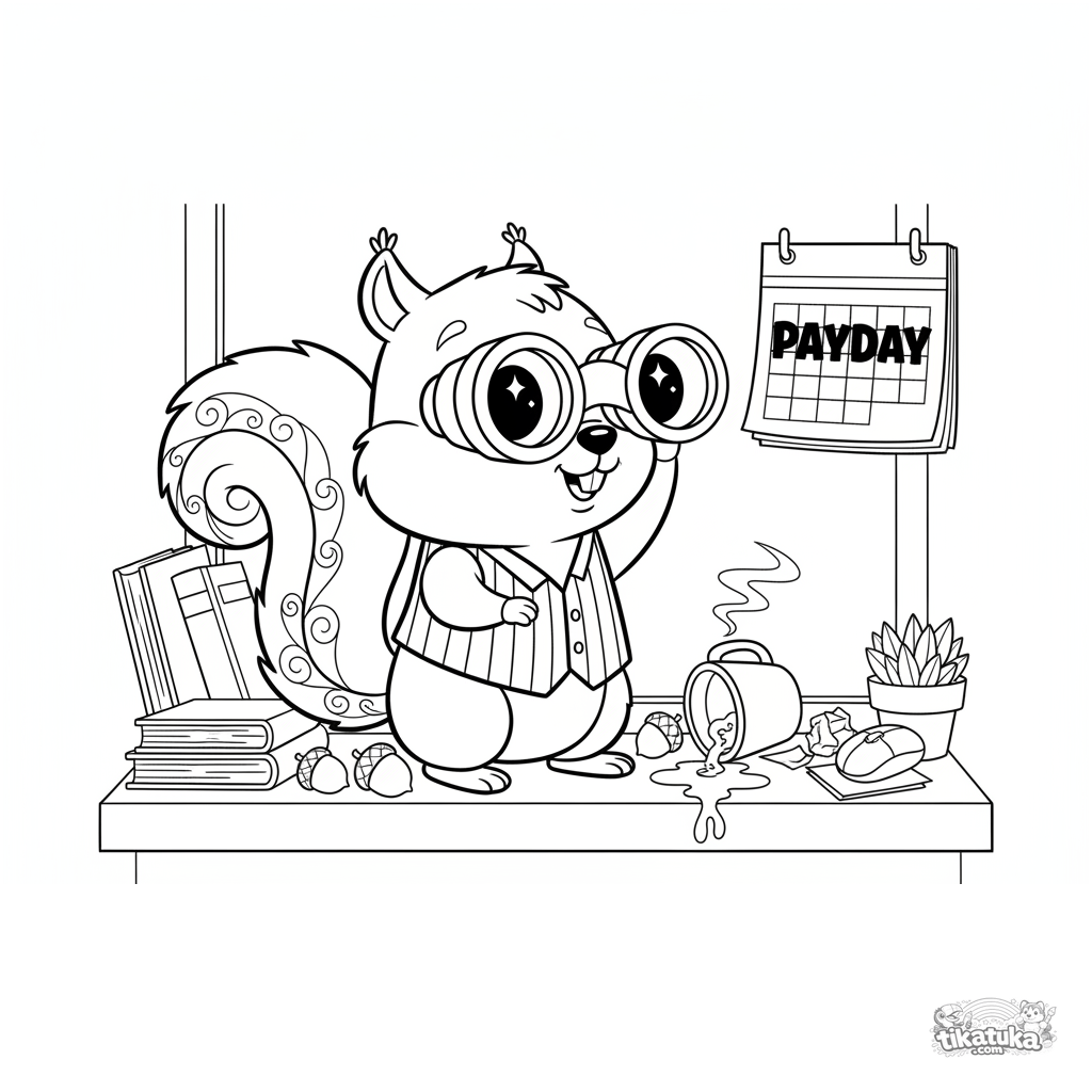 Página para colorir para crianças 10-12: um esquilo dramático de colete usa binóculos para procurar o dia do pagamento no parapeito de um escritório.