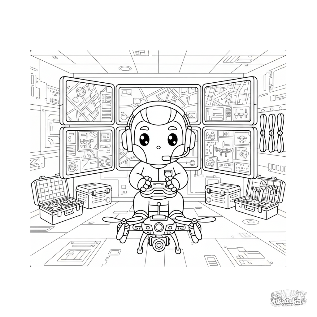 Página para colorir para crianças de 10-12 anos: um operador pilota um drone usando um controle e monitores em um centro de controle no porão. Cena técnica em estilo diagrama técnico.