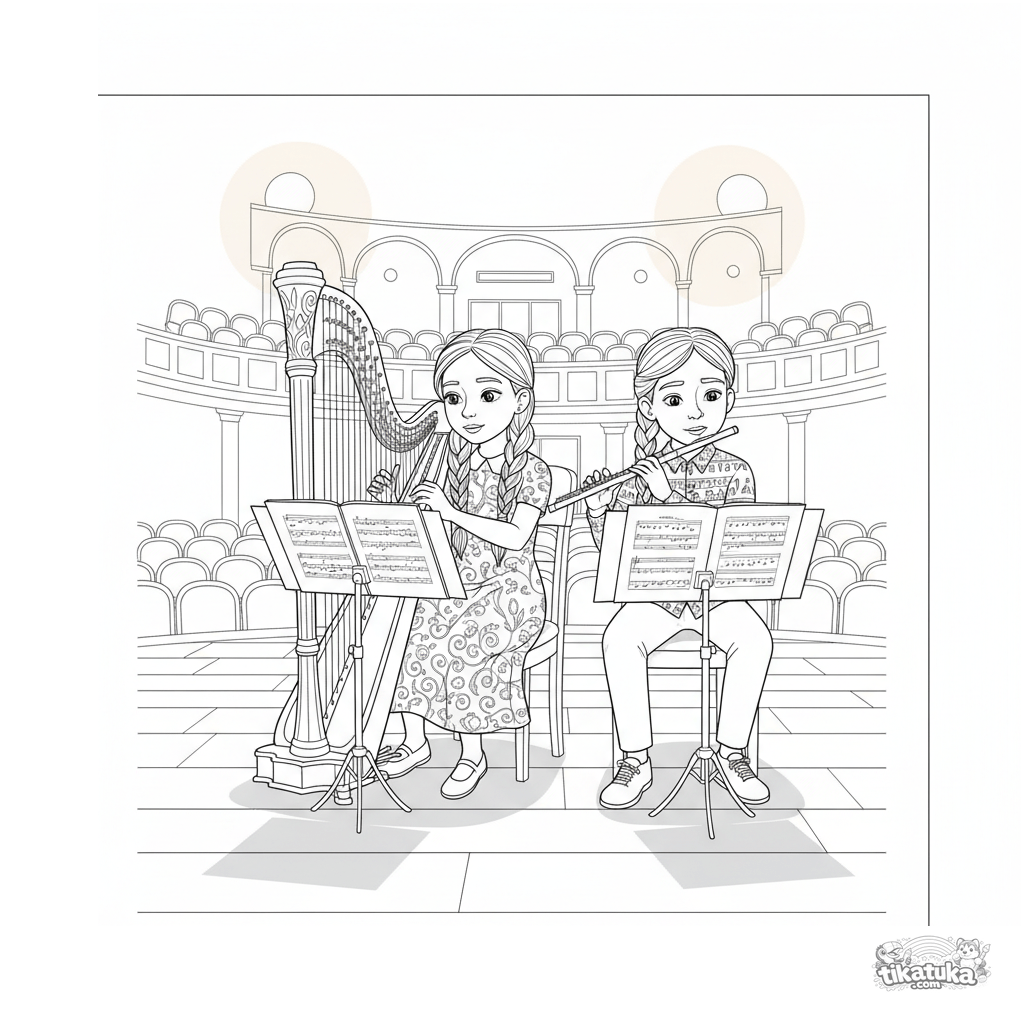 Página para colorir complexa para 10-12 anos: uma dupla de jovens músicos tocando harpa e flauta em um grande palco de sala de concertos.