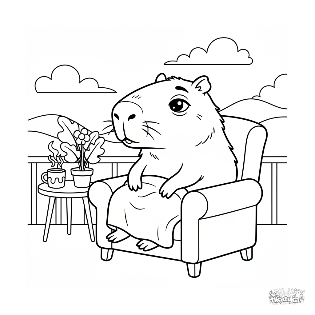 Página para colorir para 7-9 anos: uma sábia capivara idosa descansa em uma poltrona na varanda observando o pôr do sol. Cena aconchegante no estilo boneco de pelúcia.