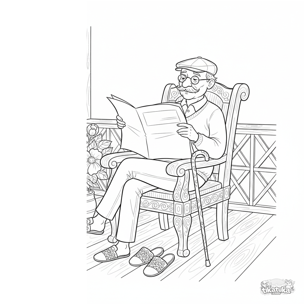 Página detalhada para colorir para crianças de 10-12 anos: um avô de óculos lê um jornal em uma poltrona na varanda.