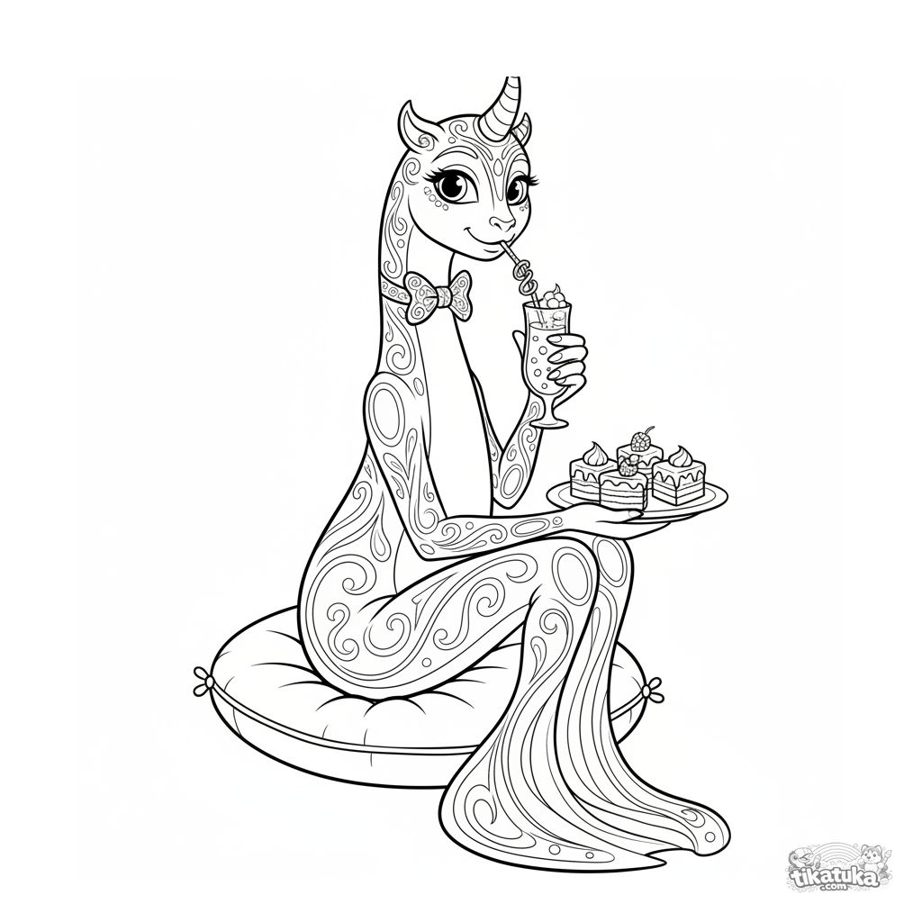 Página intrincada para colorir de um monstro elegante de pescoço longo bebendo em um piquenique. Para crianças mais velhas de 10-12 anos, linhas decorativas.