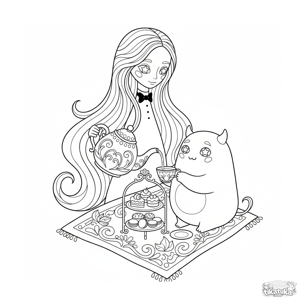 Página para colorir para crianças mais velhas 10-12: um monstro elegante em estilo art nouveau servindo chá de um bule gigante em um piquenique chique. Cena detalhada com amigos.