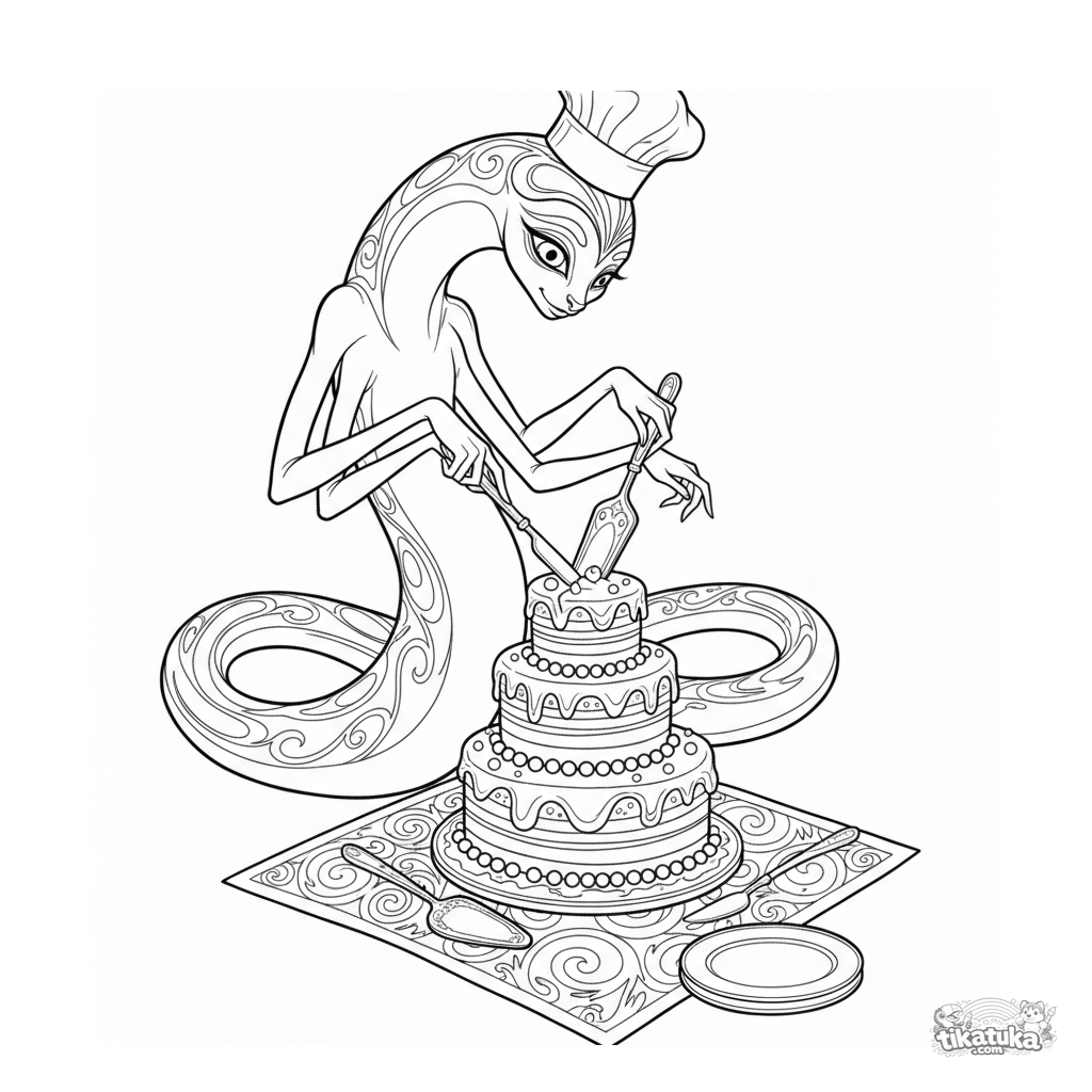 Página detalhada para colorir para 10-12 anos: um monstro elegante de vários braços com chapéu de chef corta um bolo de celebração em um piquenique. Linhas e decorações intrincadas.