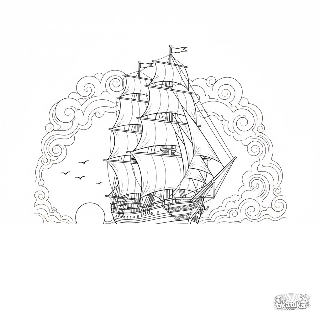 Página para colorir detalhada para crianças mais velhas 10-12: um majestoso navio à vela com velas cheias desliza em um mar calmo ao pôr do sol, com reflexo na água e aves marinhas distantes.